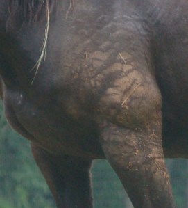 This was Mathilda’s shoulder one morning recently. We have no idea where in her pen she found mud to lie on. More importantly, we are glad she lays down to rest. We are glad she can get back up. We are overjoyed that we don’t have to watch [Debriefing].