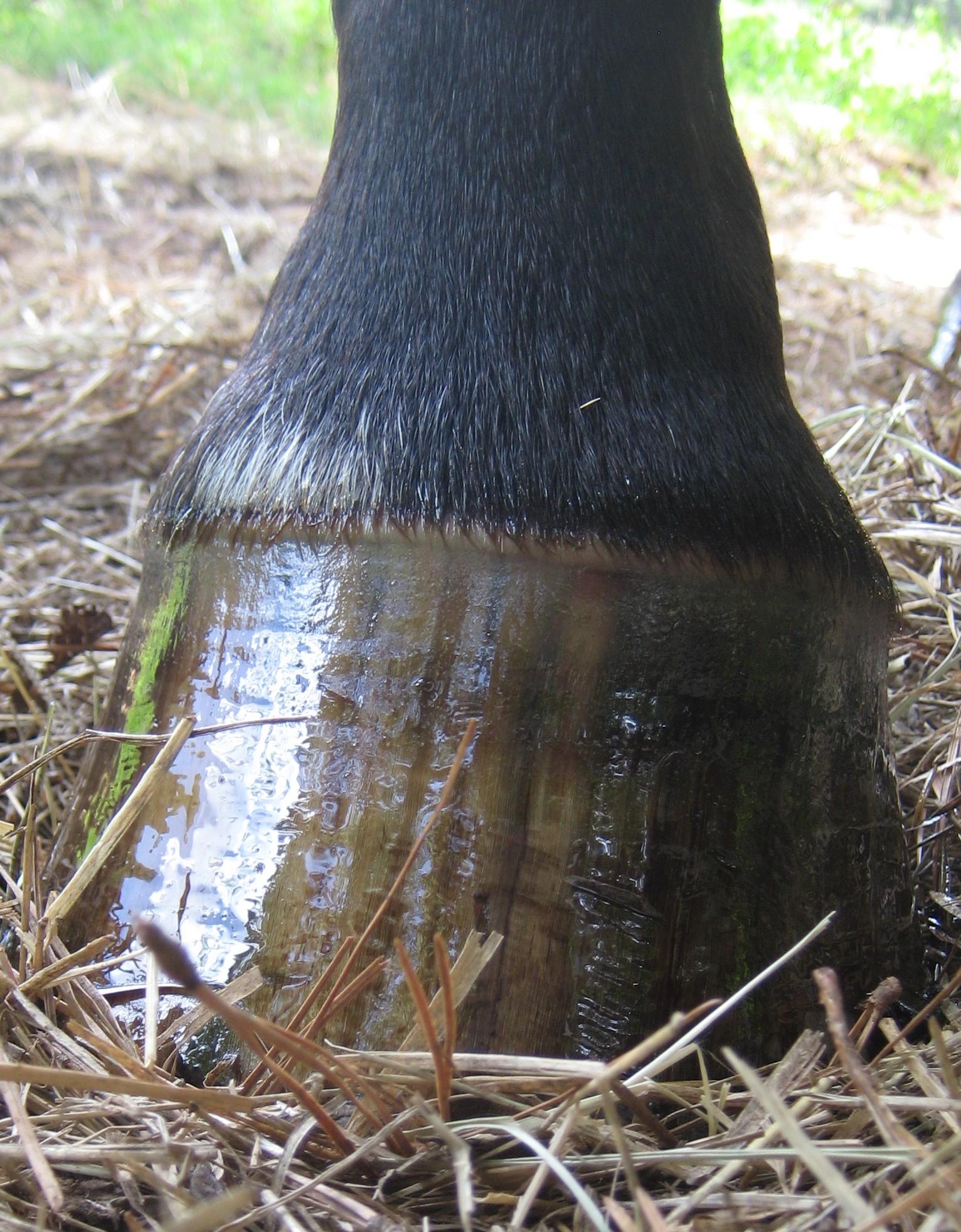 A quick drizzle of hoof oil prior to hosing protects the hoof wall from the wet/dry rollercoaster.