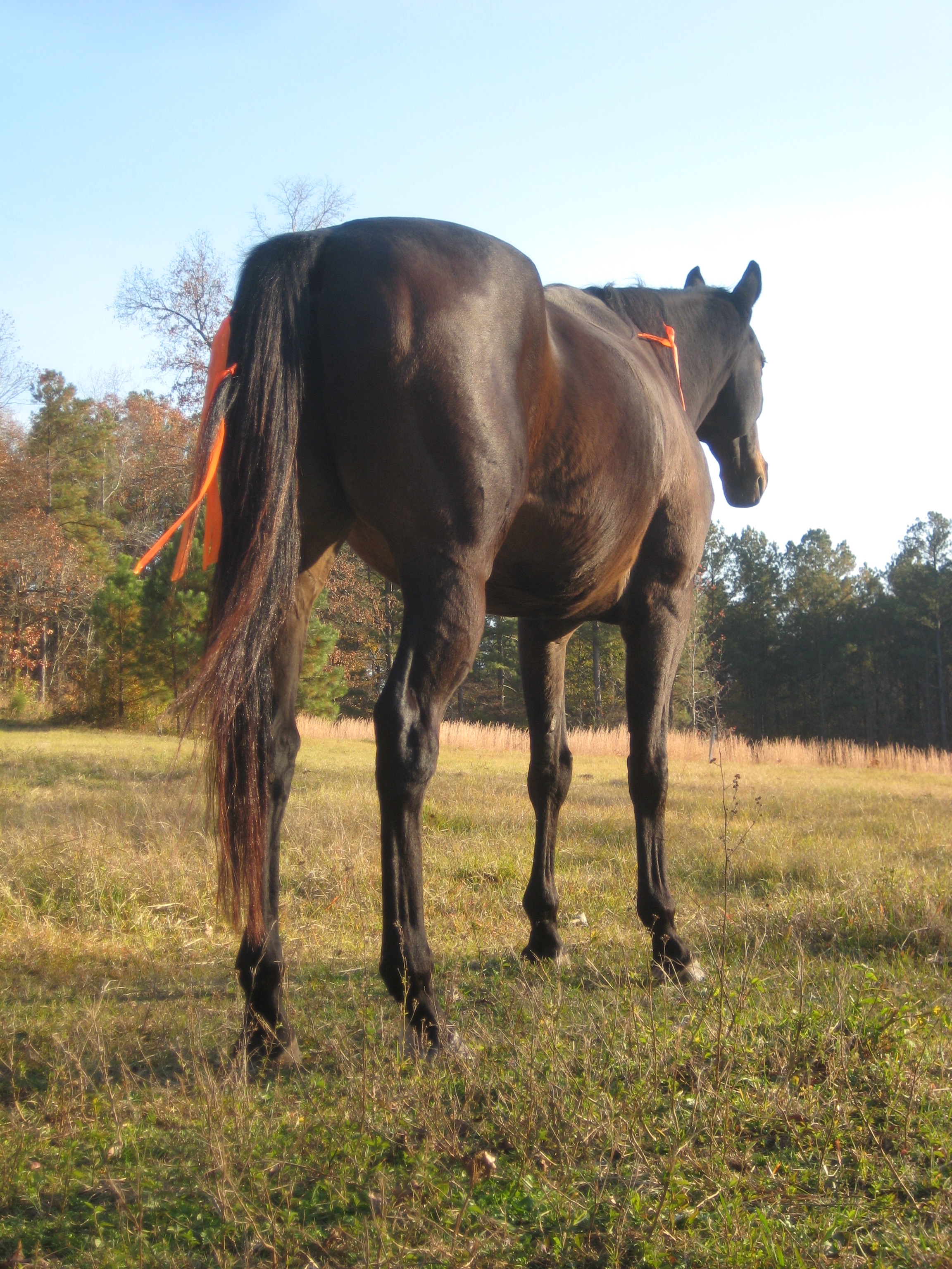 One full side of our property borders a state forest. It’s one of the biggest, most hunted in the state. For years I didn’t worry much about hunters taking pot shots at my grey Arabian, but now that my ride is a chestnut I do think about it on occasion. That said, we leave our horses out. And we also allow hunters (always the same group, 3 generations worth now) to park in the lane to our barn. About twenty years ago they posted our little dead-end road a no parking zone and our location for hunters looking to park near a trail head is prime. We love those guys. Late in the season they bring us fresh venison steaks and whiskey to thank us. It always makes me smile when I go out to feed early in the morning and see a couple of trucks parked in our lane. They arrive well before daylight, driving past our sleeping dark house and unload their gear while the horses snort and whuffle at them from the pasture. I’ve been known to do a good bit of trail riding in the state forest during hunting season. I dress in bright orange and talk loudly … even when I’m riding alone! π