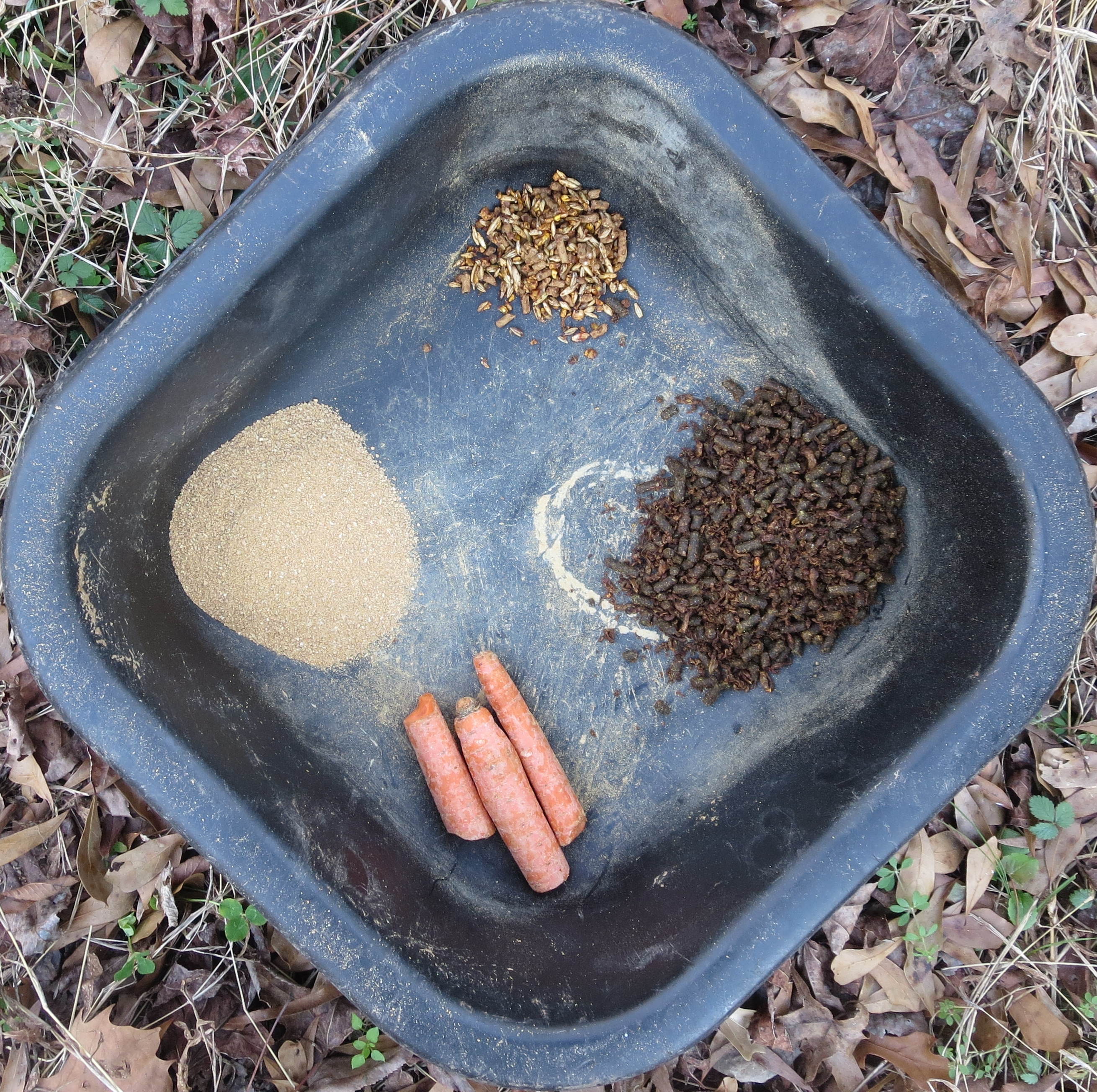 This is what we feed our 17h, 1300lb horse. A minuscule amount. For comparison, Mathilda is six inches shorter, 300 pounds lighter, and gets twelve times the amount of food (1 cup vs 3 quarts). They both eat three times a day.
