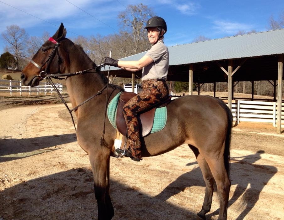 Maggie, my noble steed for the final Winter Tournament show, waiting for a lesson at home. Everyone else is in the ring, so she’s wondering why are we aren’t. Have I mentioned that I hate how I look on a horse [Lights]? All I can see are the flaws. And the pants. Hard to miss the pants.