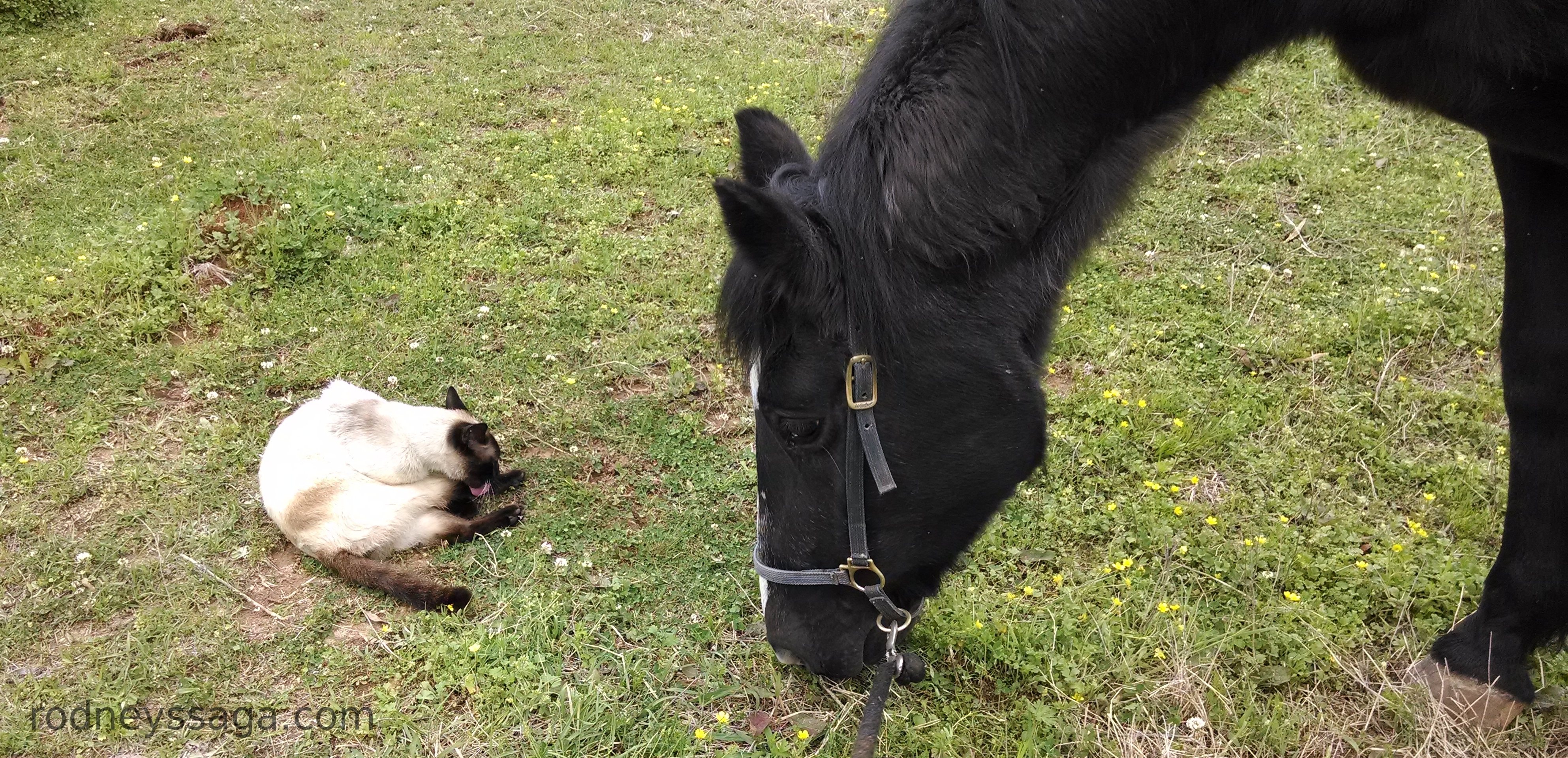 Rodney now lives out 24/7. Previously, he had been in his stall either to give Mathilda run of the pasture or to keep her company at night. On Friday, we brought him out to look and sniff. He spooked a little and then grazed by where she lay. He appears to be adjusting to life as a single horse. He certainly misses access to her leftover feed, special hay, & treats. He looks to us for company. But, so far, no running about or hysteria.
