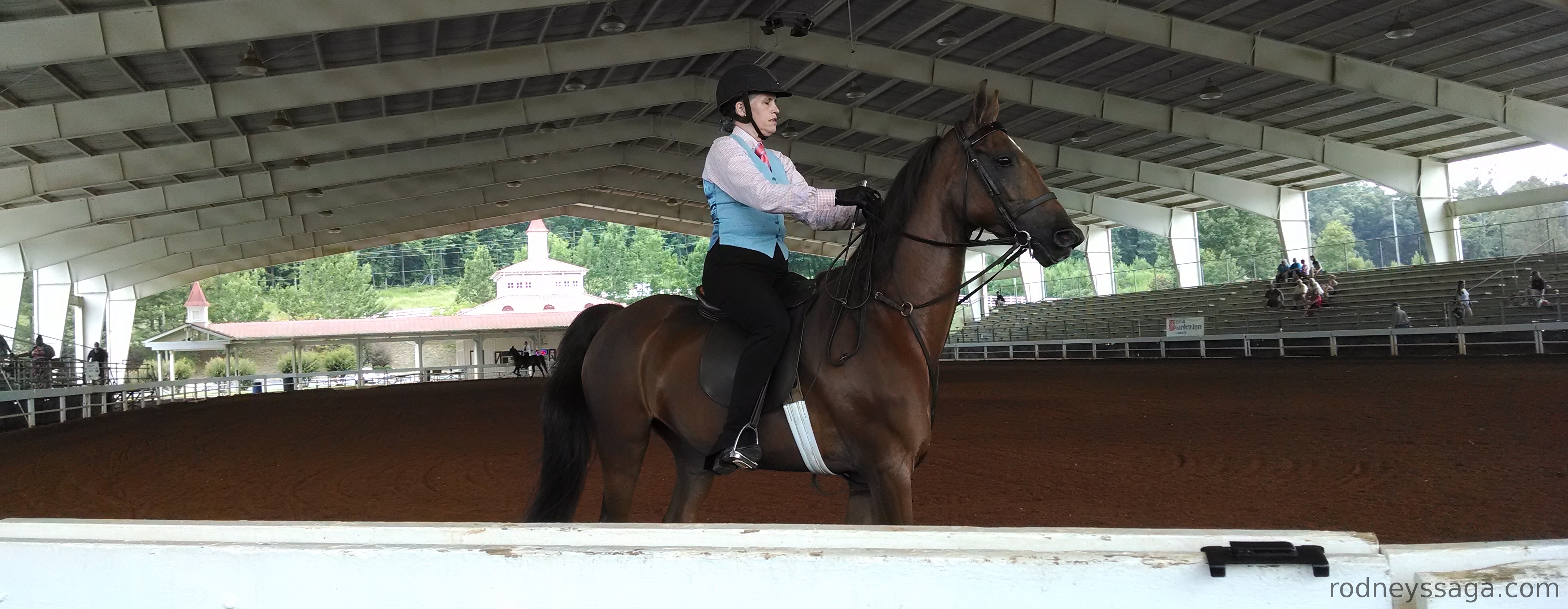I once again failed to gather and direct my mount’s wandering attention. Halfway through, I reached back to give her a loud smack behind the saddle. I hoped this would cause her to sober up and fly right. Lola was not pleased. Neither was the judge.