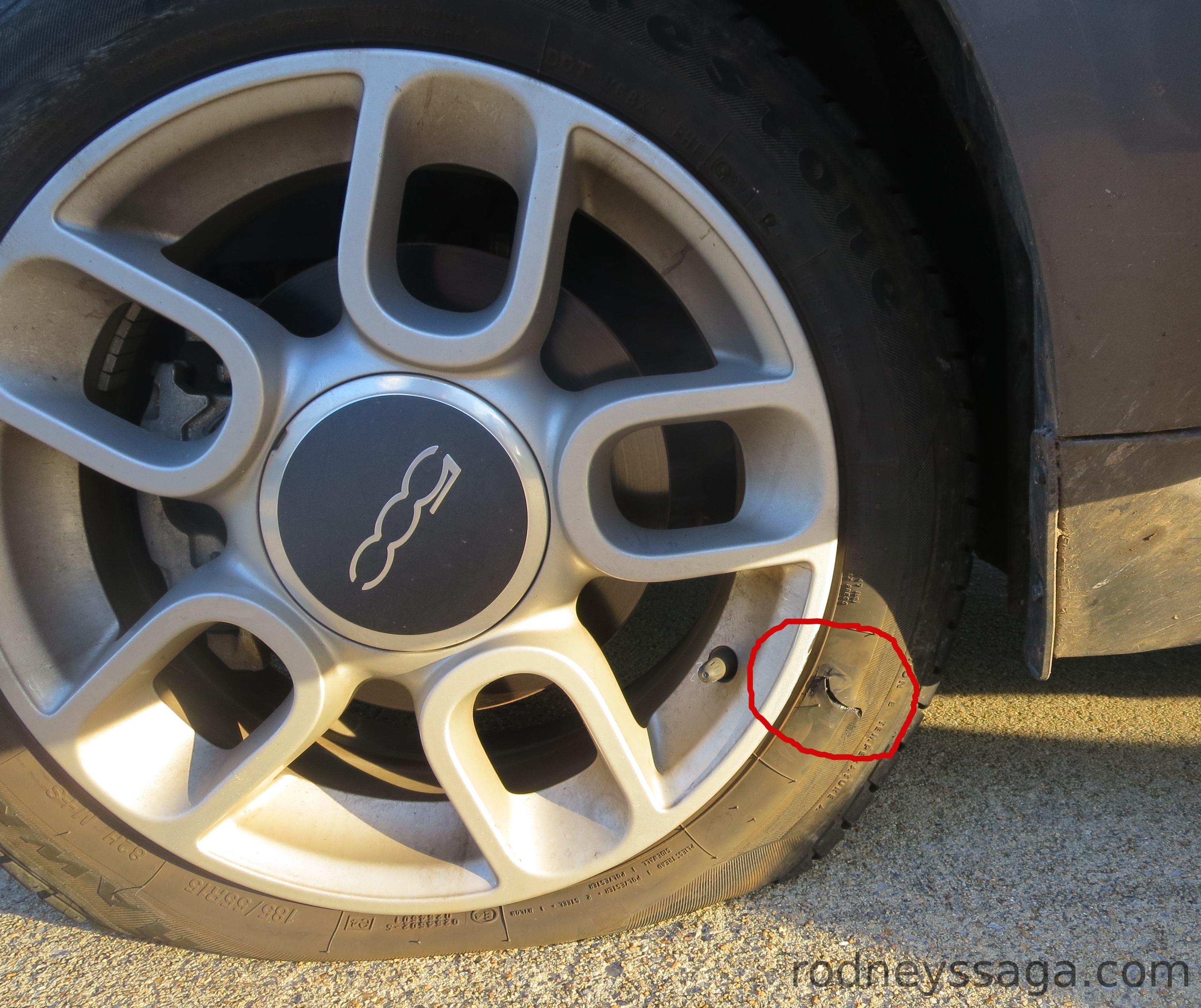 To save space, the Fiat carries sealant instead of a spare. This would have worked with a normal puncture, at least enough for us to limp home.
