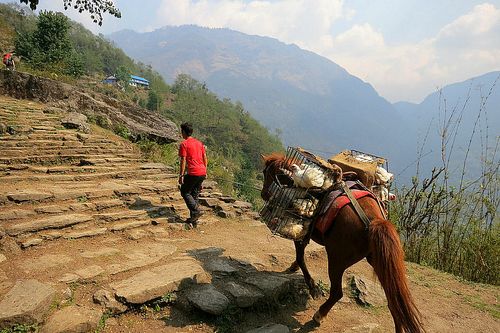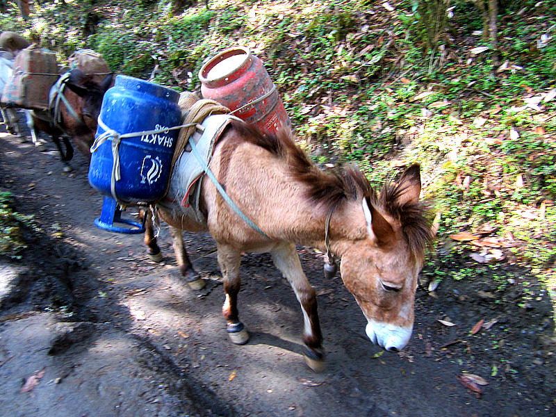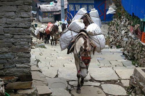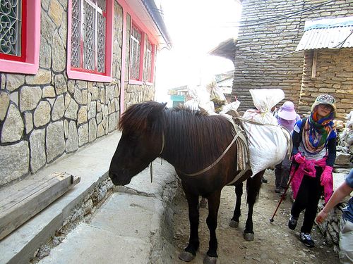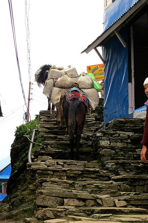 The pack animals were amazingly hardy, clomping up and down the steps and hills without a misstep. Generally they were in a train, and generally, one or all of them wore bells, so that trekkers could hear them coming and get out of the way. They didn’t really suffer fools, these working equines, so it was a good idea to step aside when they were coming through.