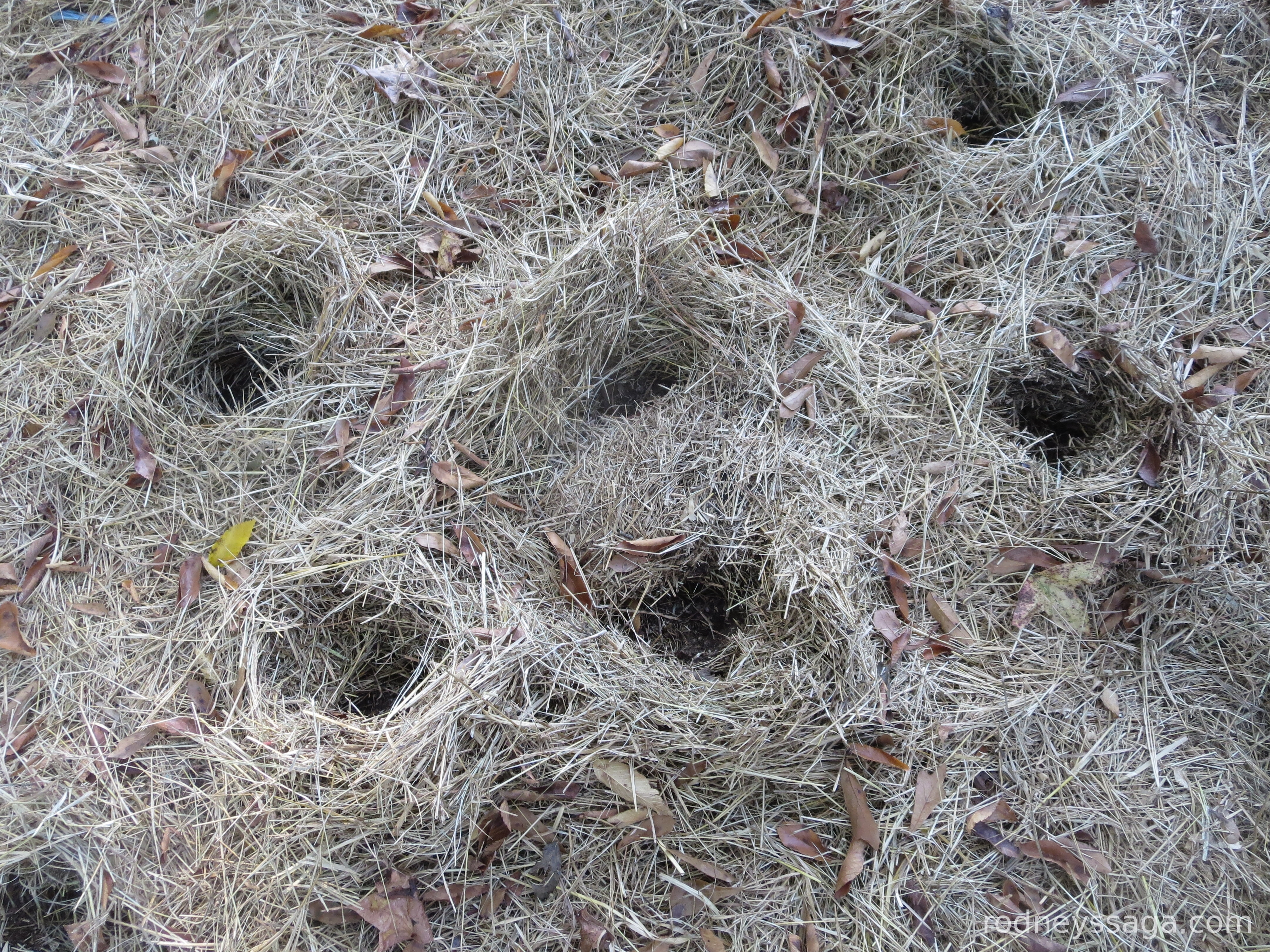 I sweep old, unused hay out to the dirt area in front of the barn for erosion control. Some critter comes along and digs perfectly round, 3″ holes. Over a dozen in one night. Again I say unto you, WTF?