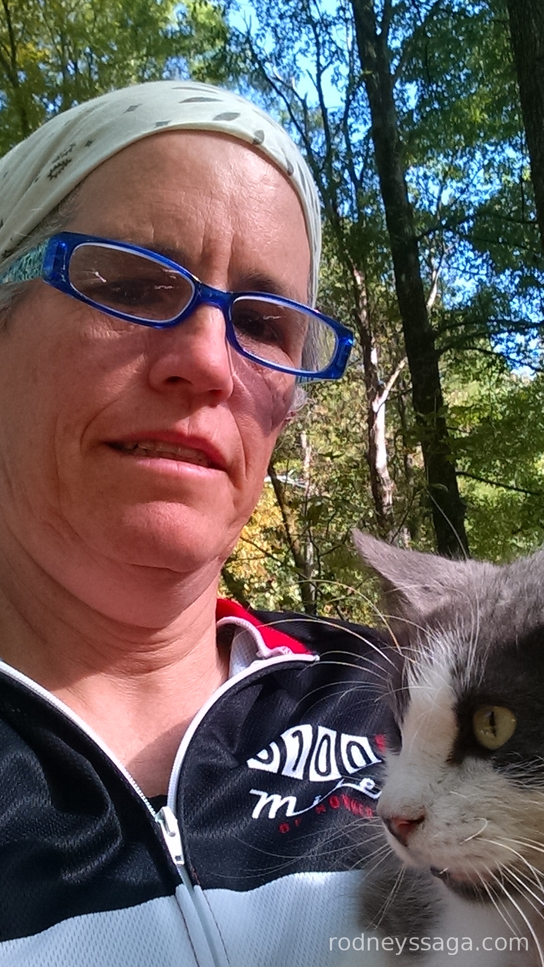 Gratuitous finish line selfie with a purring but uninterested fan, who did absolutely no miles today.