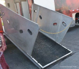 Attention to detail: a chain across the ramp to keep the public from wandering up. While the horses waited to unload, all the Budweiser folk gathering in the harness truck. Most of the public was up by the front trailers looking at the horses. I got the feeling that the harness bay was where one went to get away from the crowd for a few minutes.