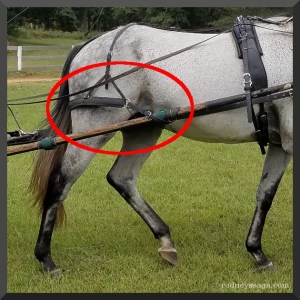 When going downhill, the breeching keeps the cart from running up on the horse. Saddlebred harness does not have this. They do not expect to be going up hill and down dale. If breech-less harness goes downhill, say into the ring at Louisville, a person hangs onto the back of the cart to perform the same function. Biggest show of the ASB year and you have drag your help into the ring. But I digress.