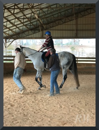 I was expecting to walk a few steps on a lead. We – it was most definitely a group effort – ended up letting me walk and steer solo. Coach Courtney thought we were ready to trot. We decided to declare victory and go home. Pushing the envelope has not worked for us in the past. Festina lente.