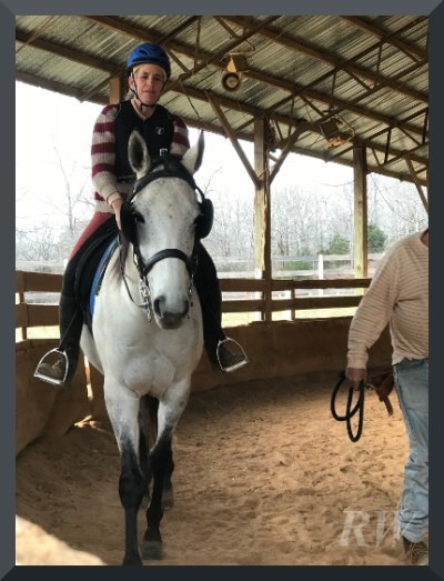 I’ve been saying all along that I wanted someone else to ride Milton first. Come the day, I decided I could do it myself. We were a) in an enclosed space, b) in a place Milton knew well, and c) Coach Courtney was right there making useful suggestions, such as “Maybe loosen the grip on his mane and pick up your reins.”