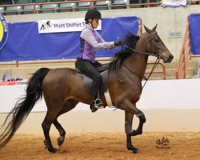 My trifecta of saddle seat sins: looking down, leaning forward, and riding off my lower leg. Observe the daylight between my knee and the saddle. At least my hands are up?