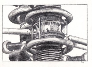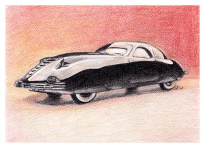 Interior art was almost done in black and white — pen & ink, pencil, or waxy pencil on a textured paper called coquille. The latter technique is little used today, but useful for creating texture patterns, similar to stippling in pen & ink, but with much less time and effort. I planned to demonstrate coquille to my class and had prepared three illustrations — a soviet-era power station, a 1920’s starlet, and an elegant 1930’s touring car — as examples.