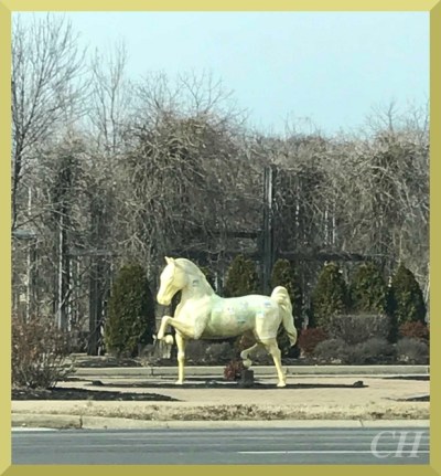 The City of St. Matthews Gallopalooza horse, dubbed “Champion”, a high stepping standardbred (Saddlebred RS) … blanketed with a map of St. Matthews that drapes the horse, this artistic piece details prominent street names and local markers, along with a random collection of vintage photos placed near appropriate locations on the map … local artist Cean Martine … is a printmaker and a believer in community and public art … is quoted as stating that she wanted the horse to be “bright, cheerful and festive”.