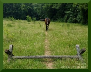 As a giggle, for a little variety last weekend, Husband Greg put three cavaletto at the lowest settling along a well-trodden path in the field. Voila, instant “cross-country.” We expected both horses to trot casually back and forth a few times.