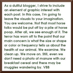 When I groomed for or rode the crazy opinionated jumper mare [photo, story], she knew what it meant when I was the one getting her out of the field. Horse show! Horse show! She would start pooping immediately and continue at regular intervals. It was a masterwork of resource management. No matter how much she had generated, she could always squeeze out a few more balls. She did not do this in her daily life. It was a performance reserved for competition mornings.