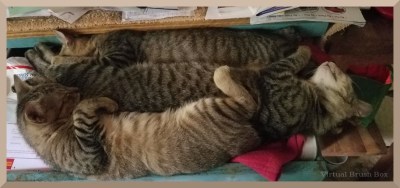 They are affectionate but do not demand affection. All four are perfectly happy to purr if picked up or petted, otherwise, they get on with their mysterious, boisterous kitten activities, or collapse in their higgledy-piggledy group naps.