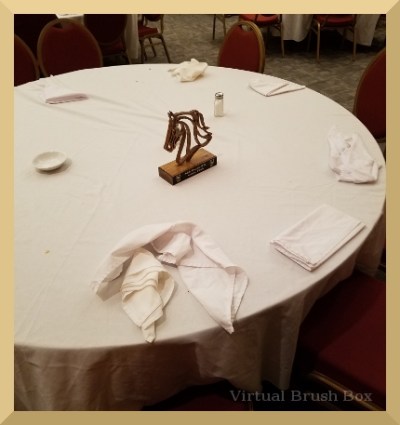 In that spirit, I give you our banquet table after dinner. Which one do you think was me? I promise, I did not stage my napkin for effect. The idea came to me when I saw the table while I was packing up.