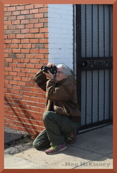 Photo of me by Meg McKinney [posts] from a field trip to Bessemer, AL, during a recent photo class [Mural, Trail]. Cropped by me to remove other class members, at least one of whom does not like their picture taken. Added border & watermark.