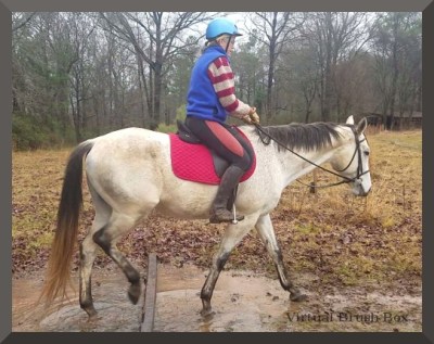 Remember how Priney (short for Princess, folks) hated to get her feet wet? That one ride where she thought the mud was water and the water was the mud, and she got stuck up to her hocks and Bently (or was it Jeepers by then?) was laughing his horsey face off? As were we. Took forever to get that mud off of her.