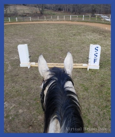 We had several Eeeek-a-bug moments over this, but I went with him (kinda), he landed quietly, and came around to do it again. Part of the problem was steering. I could not get him to turn into it, so we would swerve out to the right and end up over the larger – relatively – side piece. He utterly failed to have a hissy fit on the far side of the jump. Yay!