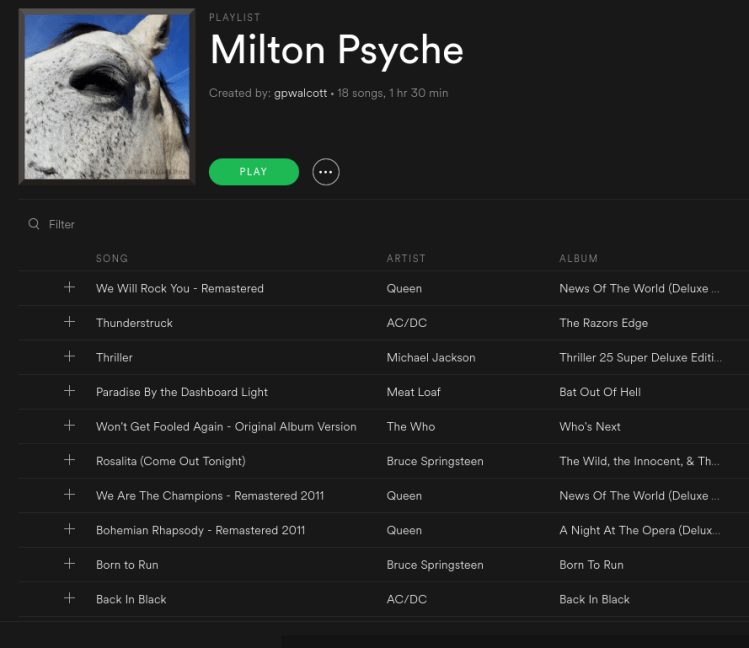 More Update. The above is a screenshot. To play the list, you need to have/sign up for an account at Spotify.com. It’s free, or at least doesn’t cost money. I assume such companies are profiting off us in some way. TANSTAAFL. But I digress. Once you have an account, find the search bar. Enter “Milton Psyche”. That should work, at least that’s want I did. Thus exhausts my knowledge of Spotify.