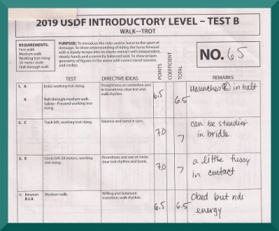 Class 4 – 2019 USDF Intro Test B (Walk-Trot) – Adult, 4th of 6, 68%