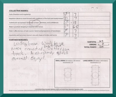 Congratulations! A Win all around! The judge’s comments are nice to see- very encouraging. Your horse at a show – there and back. Competitive. A blue ribbon and good feedback! Definitely a W!!!