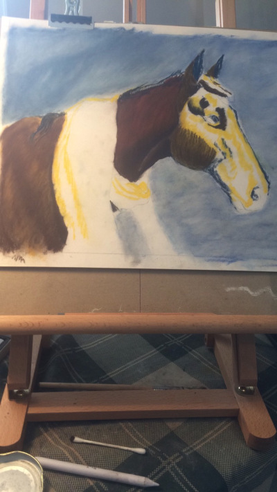 But I tried, I really did. I videoed my studio, my dogs sleeping beside me and me doing some smudging. The only problem was, the smudging footage turned out to be some really detailed coverage of my worktable. It’s hard to hold a camera and smudge pastels at the same time. So I decided that filming was not a good idea, and I returned to my usual habit of taking ‘progress’ photos.
