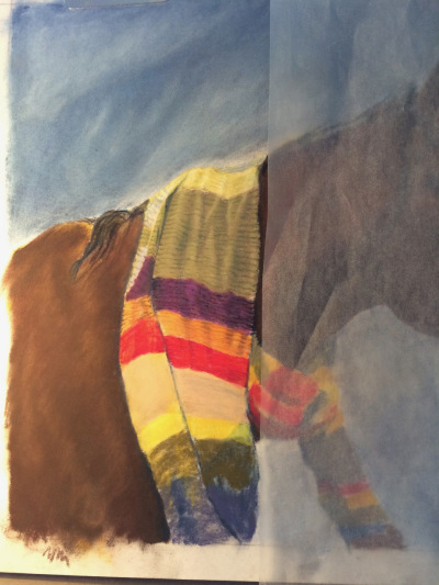 At one point, I was quite certain that I would completely ruin all my work and would have to tell Katherine I was starting again and leaving out the ****ing scarf. But I persevered. Sketched in the folds and the way it draped. Got the colours as close as I could. Worked on the shadows under Rodney’s neck. And then painstakingly shaded in each knitted row. Technical aside – for all of those fine lines, I used pastel pencils, not pastel sticks.
