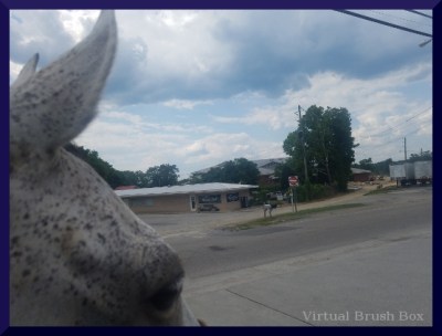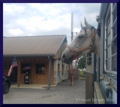 Milton definitely has his trailer legs. I stopped counting how often we go off the property with him. He’s been to highway rest stops [not a post]. He’s been to roadside convenience stores for ice before shows. He’s even stopped for gas, although I try to have the truck’s gas tank filled beforehand. Last weekend, he had a new experience. We stopped in the middle of town to pick up food.
