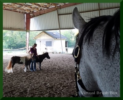 When one of the minis was hitched, Milton insisted on violently turning to keep the cart in sight. Fascination? Afraid the cart was going to eat the mini? Eat Milton? I have no idea. Although Milton drives, he hasn’t seen other horses attached to carts very often. Horses frequently object to seeing horses pulling carts [not a post “At Full Circle, the resident horses …”].