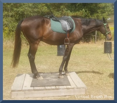 That was a narrow bridge for a big horse. I tried it a few times longwise. No, Ma’am. He’d walk up to it and look at it, but wouldn’t step on it. After a few tries, I asked him to go over it crosswise to give him the idea. He stepped on it but tripped/slid. Okay, done with that.