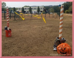 Even though we did this fine in-hand, I did not expect it to go flawlessly under saddle. He has trouble coming alongside gates [Gotta Go Through It]. Then the animated skull went off. Either it didn’t during the in-hand, or we didn’t notice. Rodney would get close, but not close enough. I finally leaned over farther than I should and flicked the rope off the hook. The task was Open-only, so I could let it drop. Through we went.