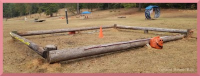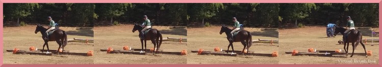 Unlisted obstacle. After three obstacles in the arena, horse and rider took a meander up the driveway, across a pasture, and down to the trail obstacle space. Right next to the space lived a mini and a donkey. Rodney spent the entire show obsessed with the minis. I honestly don’t know if he was scared of them or wanted one so that he could hug it and squeeze it and call it George. He thought the donkey was weird. He would have spent the entire trail class staring at the audience.
