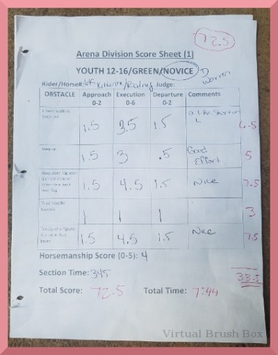 Novice. 0 of 10/11, score of 72.5 out of 100. First time in a ridden obstacle class.