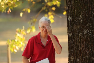 Initially, I wore Rodney’s dark green show shirt. I brought extras. She liked the red of Milton’s show shirt instead.