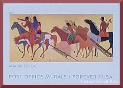 “Mopope was also chosen because he was considered by Jacobson to be the best and most outgoing artist of the “Kiowa Five,” a trait which necessary to becoming the lead for the project. His cultural ties to Anadarko, home to the Kiowa, would provide an accurate depiction of the culture from his personal experiences.” Stamp mural is one of 16 panels. The Living New Deal: Post Office Mural – Anadarko OK