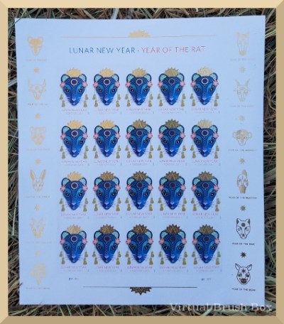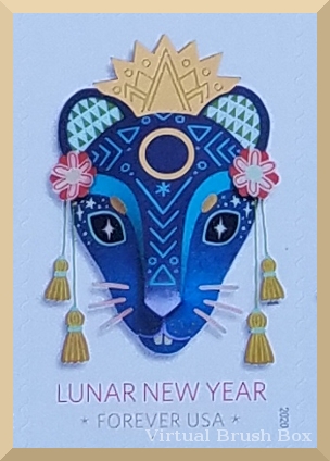 “Patterns based on Asian textiles are visible on the mask. The circle in the middle of the rat’s head symbolizes the new moon that heralds the beginning of Lunar New Year. Specifically, Lunar New Year starts on the second new moon following the winter solstice in December.” Linn’s Stamp News: New U.S. Lunar New Year series begins Jan. 11 with Year of the Rat forever stamp
