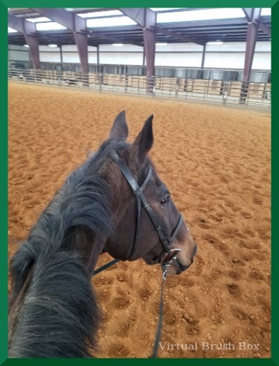 At D&D we had the arena to ourselves, so we turned him out for half an hour to explore at his own pace. He stood. He looked. He walked. He looked. At one point the cows next door mooed. Ears to full alert [Cow TV]. Fortunately, the doors on that side were closed and the cows stayed quiet after that one statement.