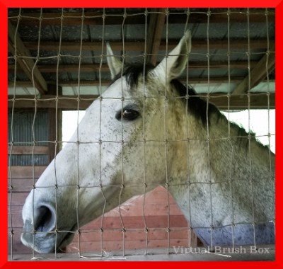 For the second time this month, Milton has come up mildly lame after a rainstorm [Moments]. We think he is frolicking foolishly. Last time, the tweak was high up in the hind end. This time, there was a small warm patch on the inside of a hind fetlock. As a repeat offender, Milton was sentence to stall rest.