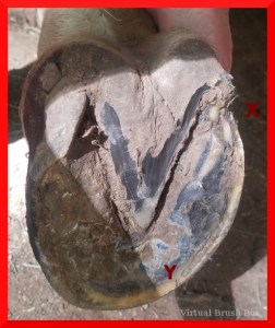 In addition to starting at the bottom of his foot and erupting out the top, looks like the abscess pushed through the length of this foot as well. You can see the remnant of the channel running along the rim on the inside of this foot, from his heel, X, to his toe, Y. Taken after his mani-pedi Friday, May 15.