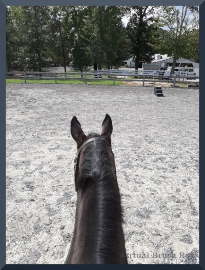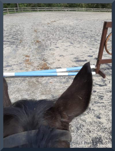 The high point of this trip was cantering out of a line of tiny, tiny crossrails. (Ear pic recreated from the ground.)