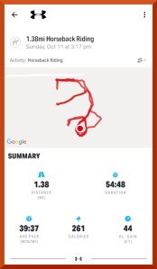 Went over to Stepping Stone Farm to school, more on this tomorrow. Originally, wasn’t going to count this mileage, since we have not been counting Rodney’s schooling trips to Falcon Hill Farm. Only had phone on me to for between-the-ears shots. Started tracker out of habit. Argued myself into counting it because, both horses did the miles, and we had some very definite trail-type obstacles to walk past.