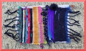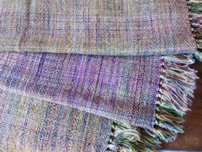 “Here are the siblings in this morning’s chilly sunshine. So one went purple, one green, and then yours. The only way to be certain they are from the same warp is to look at the fringes. This photo below was taken indoors because it was too cold to stay out!