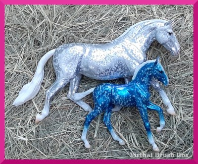 Classics, i.e. what you think of when you think of a Breyer model. Only one (two) new, La Molina & Masella. Silver filigree mare with blue filigree foal.