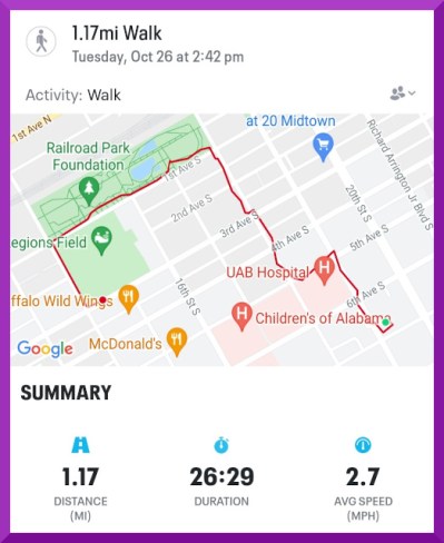Downtown Birmingham. Got into town early for appointment. Parked in order to have leisurely half-mile walk. Severely underestimated distance. Hustled to make appointment. Note the pace on the first walk! Afterward, walked back to truck. Slowly. Interesting how different the walks felt. Second walk was easy-peasey despite being the same distance. I’ve often felt that I could walk a marathon, if they would give me 10 hours to do it in.