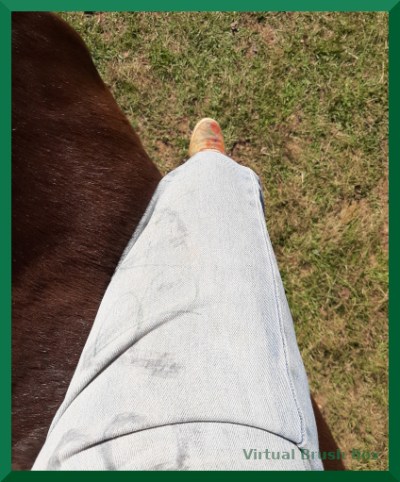 Finally, I rode Previous Horse with a saddle but bridleless in a small, round pen during a clinic. Nothing dramatic to report.