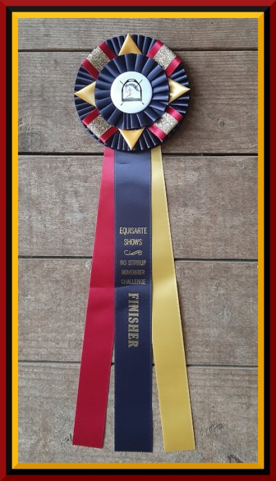 Completion ribbon for No Stirrup November by Equisarte. Red, gold, and black streamers, with glitter accents. Custom button. Fancy. [Lessons from No Stirrup November]