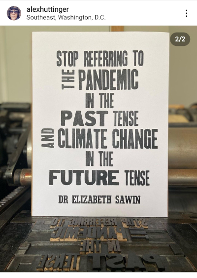 Screenshot. “Stop referring to the pandemic in the past tense and climate change in the future tense Dr. Elizabeth Sawin” Original post, Igram: alexhuttinger July 18. Source, Elizabeth Sawin. HT, Igram: dr.berthahidalgo.